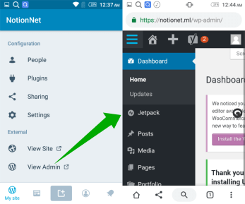 Here you can view your dashboard. You may want to view your stats, to publish a page or post, to change your sites appearance or to configure your site settings. If you are not comfortable with the interface, you can select “View Admin” on the menu. This open the default WordPress dashboard via your browser.